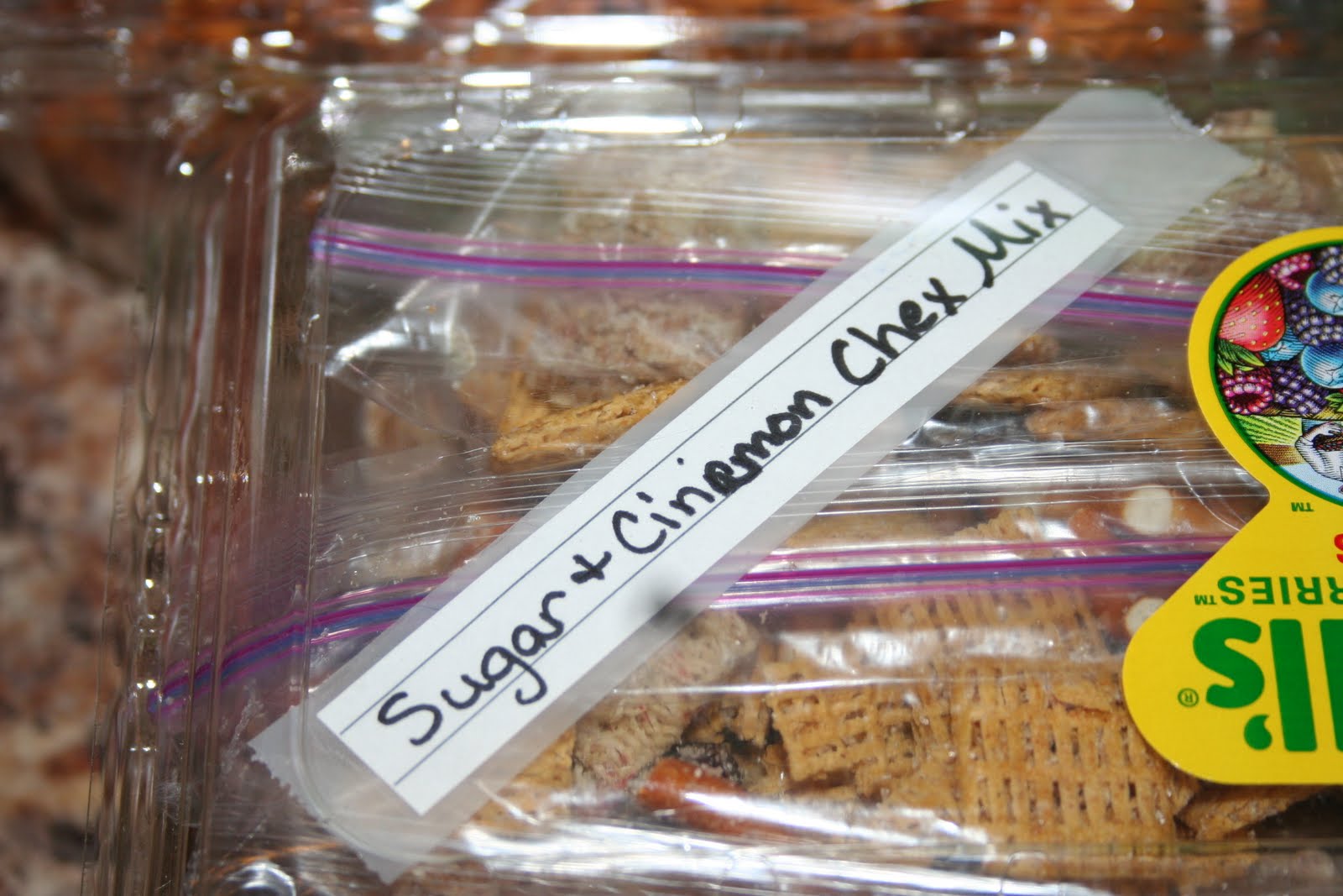 This mixture is whole wheat cheerios, pretzels, raisins and sprinkled some sugar cinnamon mix on .  Mixed and divided into baggies.  Yummy!!!
