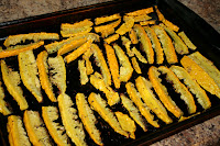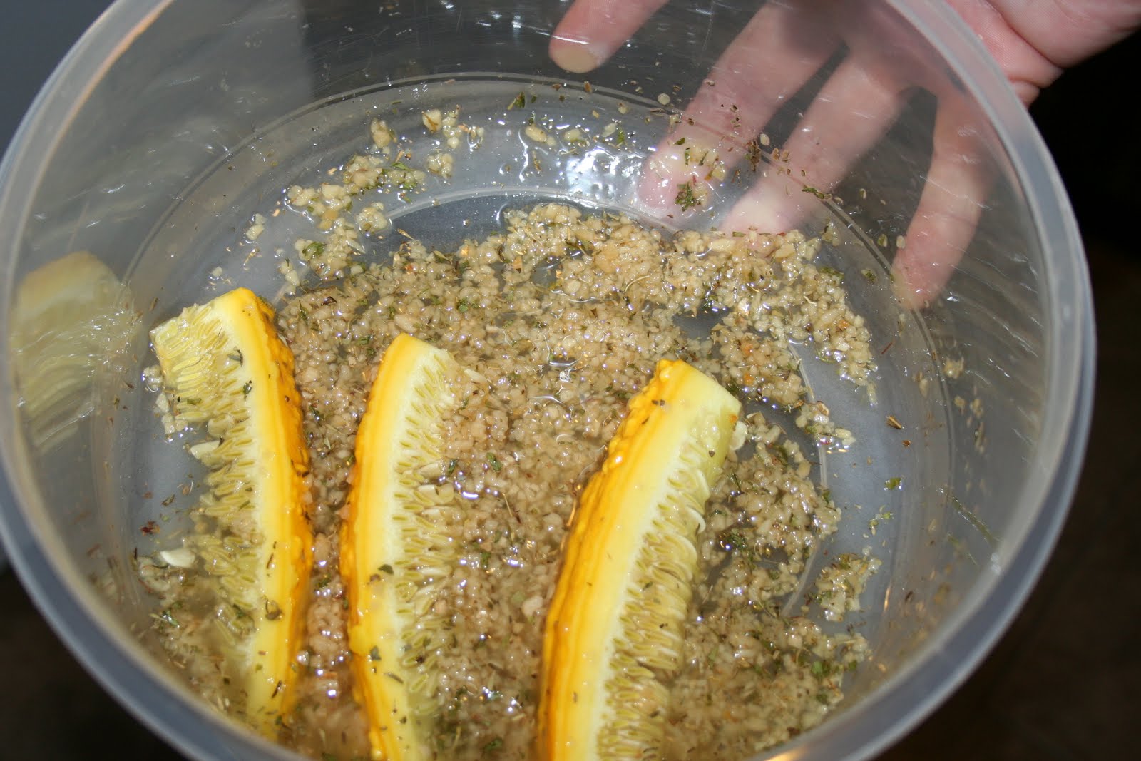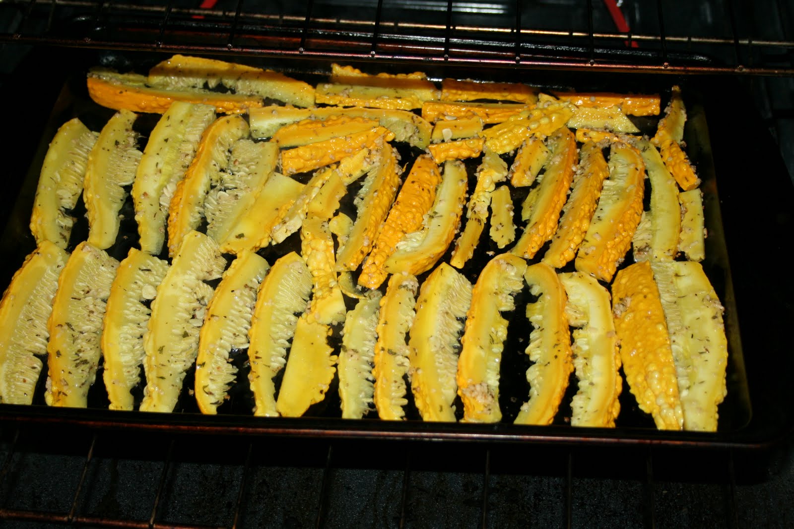- Trim the ends from the squash, and cut each squash in half lengthwise. Cut the halves in half again crosswise, to make 4 pieces; cut those pieces in half twice more the long way, to make 16 short spears from each squash. (cut them like pickles, then cut the ‘pickle’ shape in half again!) Toss the squash with olive oil and garlic in a bowl; place into a shallow baking dish or on a cookie sheet.
