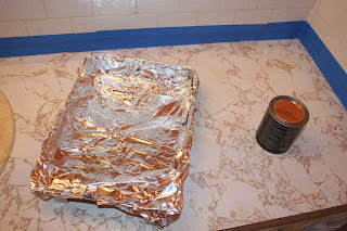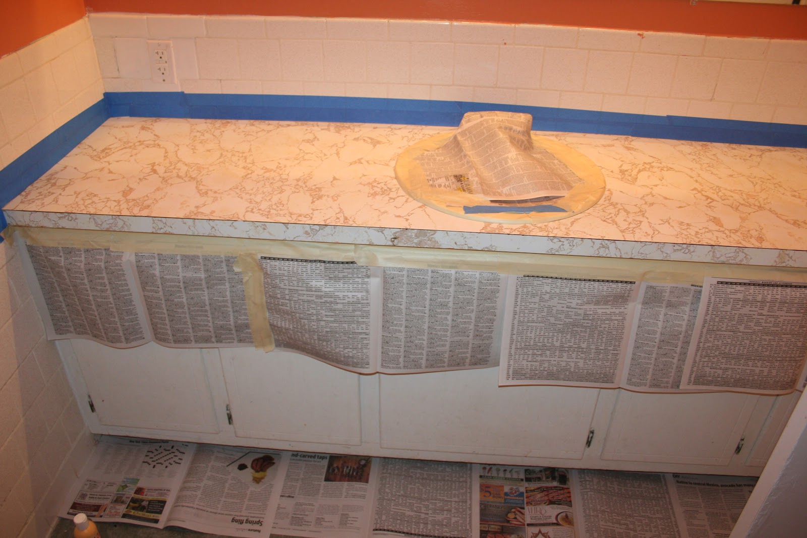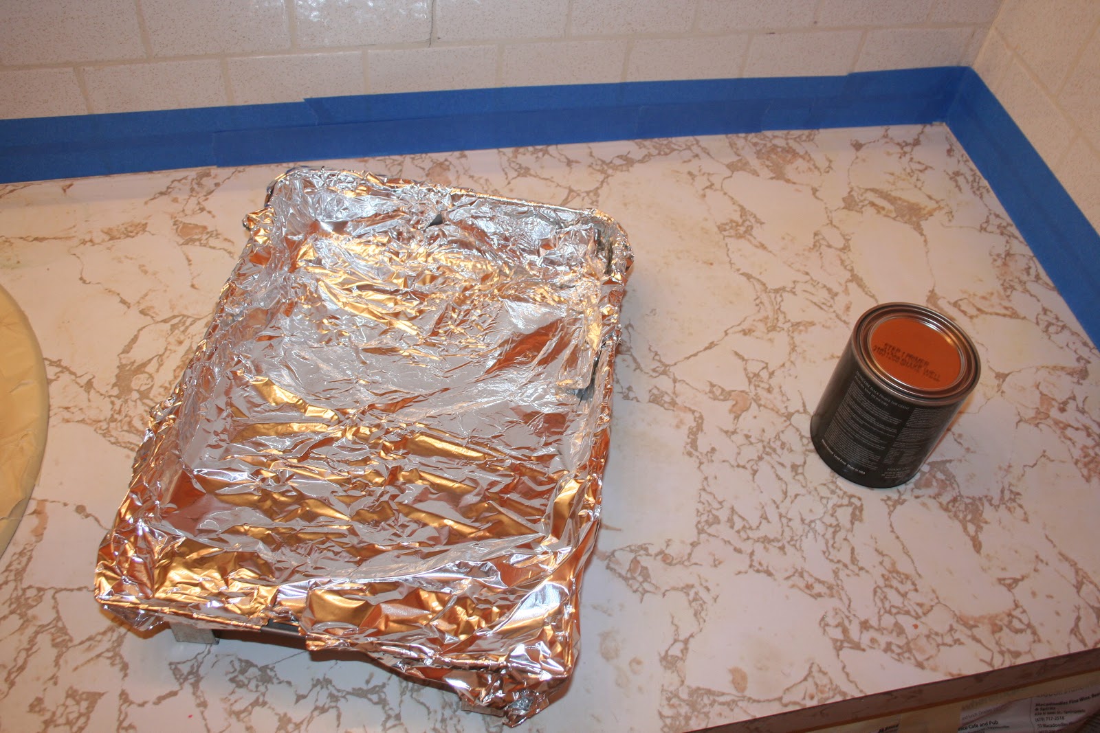 Start out by wiping down your counter really well. You want to get off any debris or bumps so that they don’t show in the paint! Next tape off everything. They suggested 2 layers of tape around the wall, I suggest three!