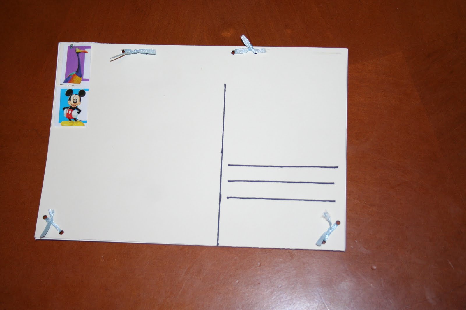| I took the back page of the card and glued it to the front so that I would have a smooth surface to write on. Drew on the postcard lines. |