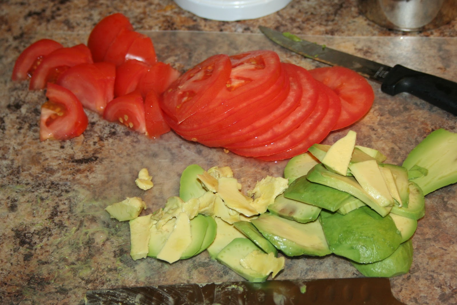 1. Peal avocado and cut into slices. Cut tomatoes. Pull of some cilantro leaves. Set aside.