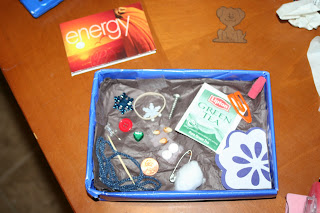 All of the items were put in with glue dots or scotch tape (some things wouldn’t stick to the dots, like the eraser!). Also, the energy thing in the upper corner is a notepad I made, I’ll do a tutorial for that eventually. I sat it on top of the stuff in the box, as I wanted her to be able to use it.